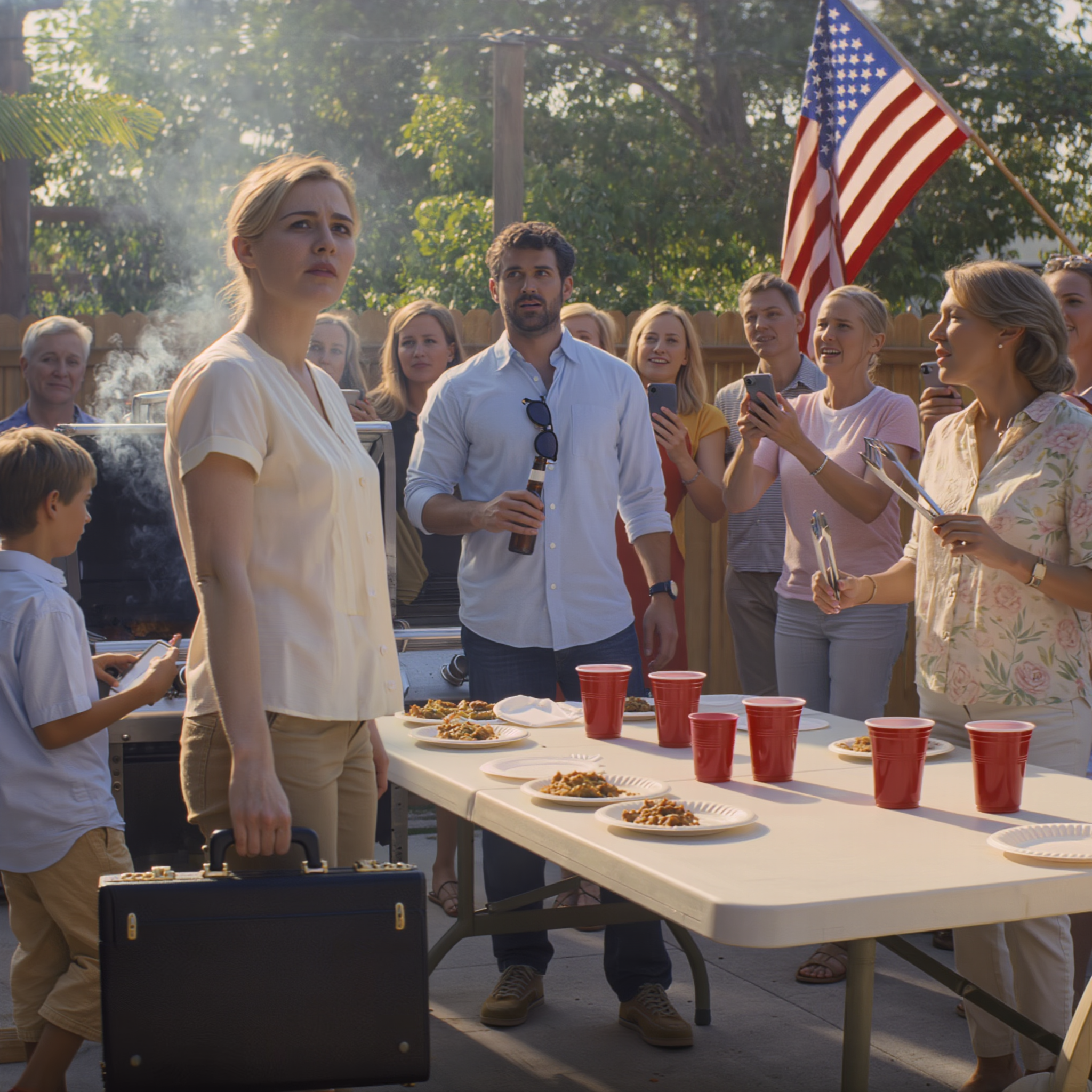 Just then, the sound of a heavy car door slamming shut echoed from the street. The gate latch clicked. Every head in the backyard turned. A man walked in. He was large, wearing a tactical vest over a gray uniform shirt. He had a badge clipped to his belt and a stack of papers in his hand. He did not look like he was here for a burger.